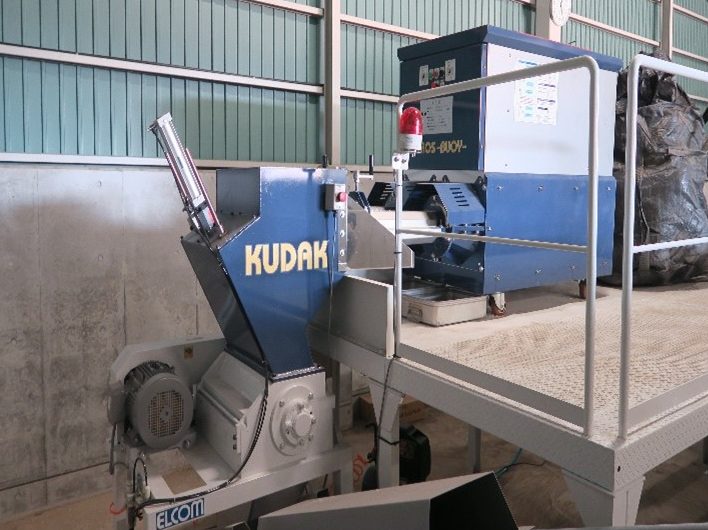 島内でエネルギー利用を可能にする小型サーマルリカバリーシステムです。今回の納品は、燃料化装置一式。装置の処理能力は、最大100㎏/h。直径80cm、長さ100cmの巨大な漂着ブイをそのまま機械に投入ができ、破砕からペレット化まで、全自動で処理を行いフレコンバックに樹脂燃料が貯留されます。