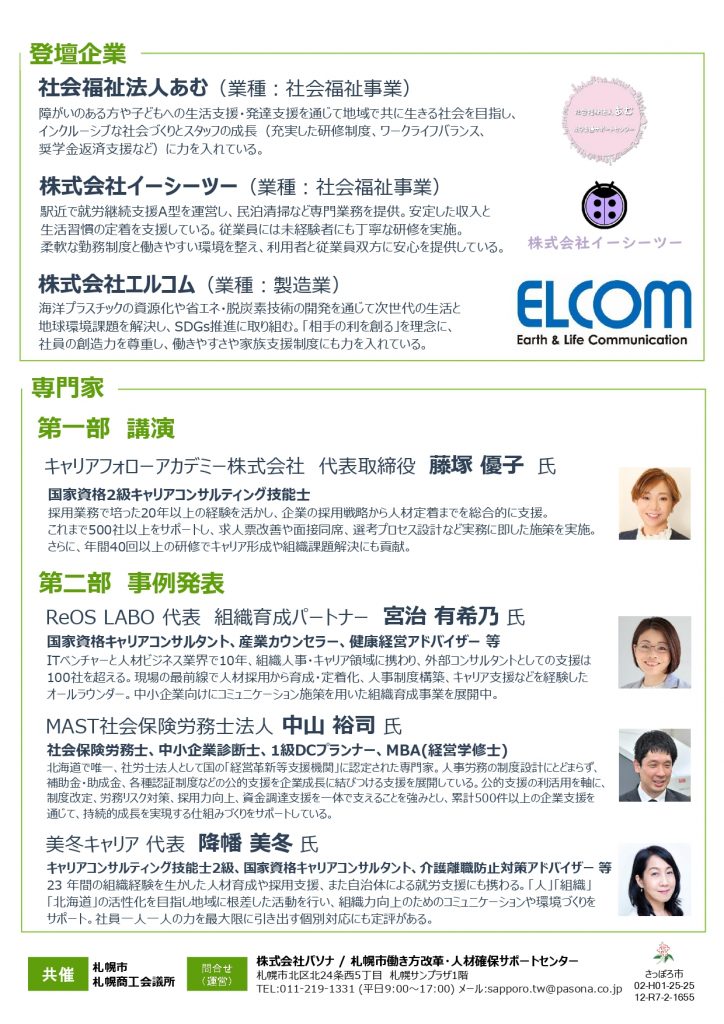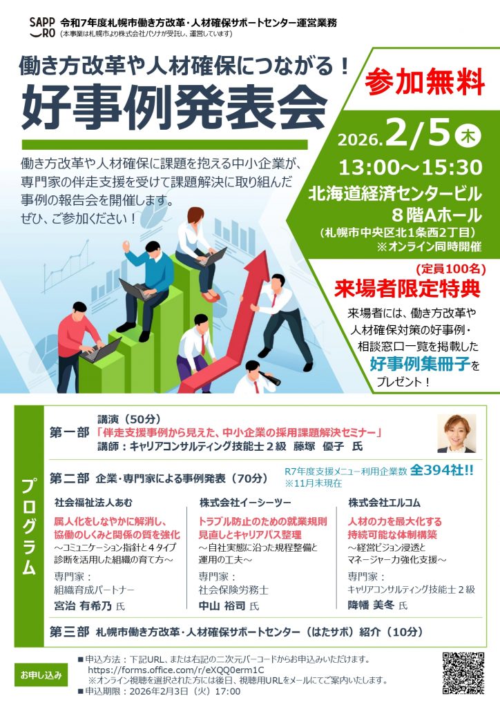 このたび、弊社代表が、札幌市札幌商工会議所共催「働き方改革・人材確保につながる好事例発表会」 に登壇いたします。