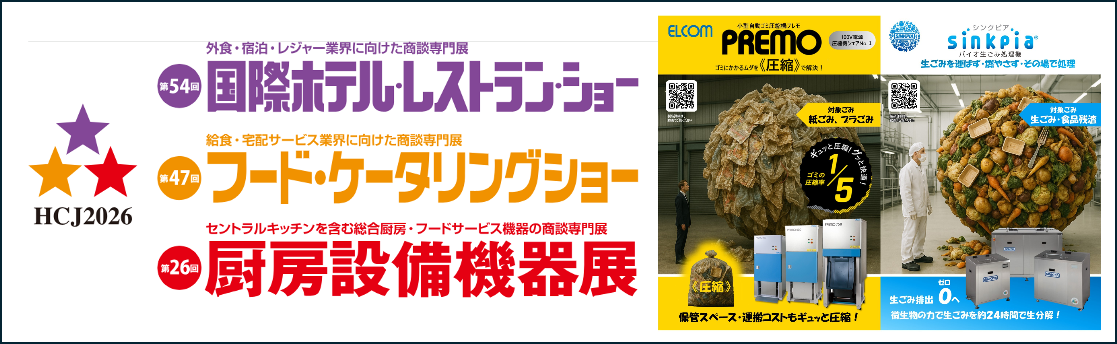 このたび当社は、国際ホテル・レストラン・ショー(会期:2026年2月17日(火)~20日(金))において、生ごみ処理機メーカー 「シンクピア・ジャパン」 様のブースへ共同出展いたします。