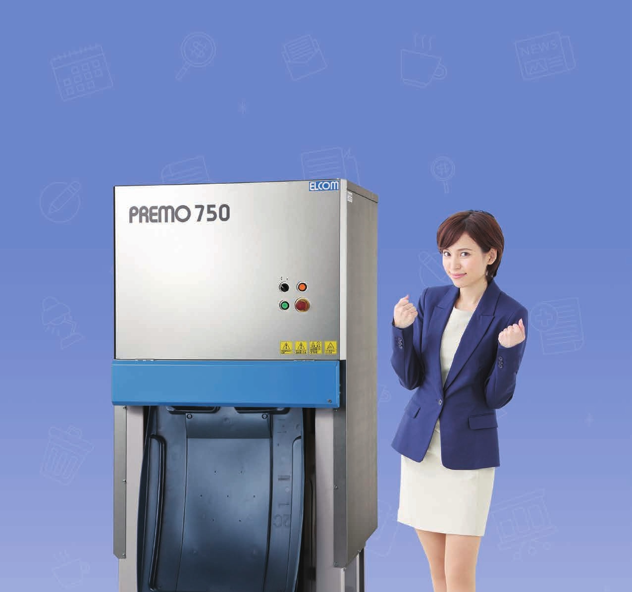 プレモ750は、設置場所に困らないスリムな圧縮機(幅81.6×奥行80×高さ175cm)です。小型・静音設計に加え、100V電源仕様なので、省電力です。圧縮後のゴミをポリコンテナ内に入れたまま保管できるので、衛生的で、臭気を抑えることができます。プレモ750の圧縮サイクルは最速23秒。一回の圧縮でかかる電気代は約0.08円です。